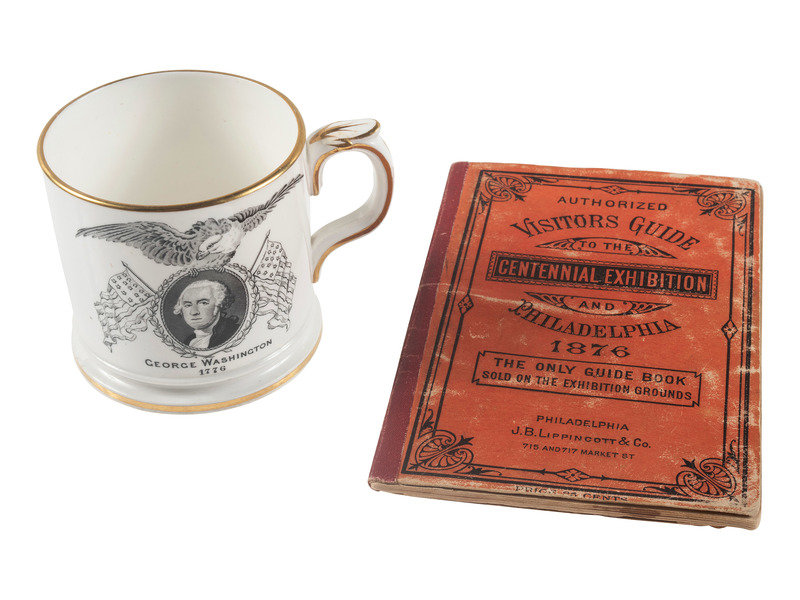 [With:] Centennial ceramic mug with George Washington image on the front flanked by American flags and surmounted by an eagle. Below is text "George Washington / 1776." Reverse with “A Memorial / of / The Centennial / 1876.” Bottom bears manufacturer's mark of W. T. Copeland & Sons along with “Solely for J.M. Shaw & Co. New York” and “Trade Mark Registered 1876.” Gilt top and bottom rims as well as gilt to the handle. Approx. 3 1/8 in. diameter (small, scattered marks but overall very good condition).
