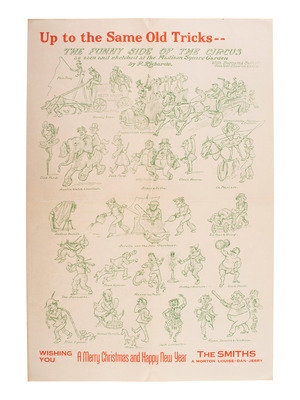 Poster/broadside “Up to the Same Old Tricks…The Funny Side of the Circus as seen and sketched at the Madison Square Garden by P. Richards / With Barnum & Bailey Greatest Show on Earth / Wishing You A Merry Christmas and Happy New Year. The Smiths / A. Morton ·Louise · Dan · Jerry.” With cartoons of 23 clown acts (not scary clowns!) A. Morton Smith was editor of the Gainesville Register and an authority on circuses. The Gainesville Community Circus evolved out of a project to make up a $300 deficit of the Little Theatre in May 1930. The first two shows were so popular that the performers gave a third show, overall earning $420. They also got a request to perform at the County Fair the following year.