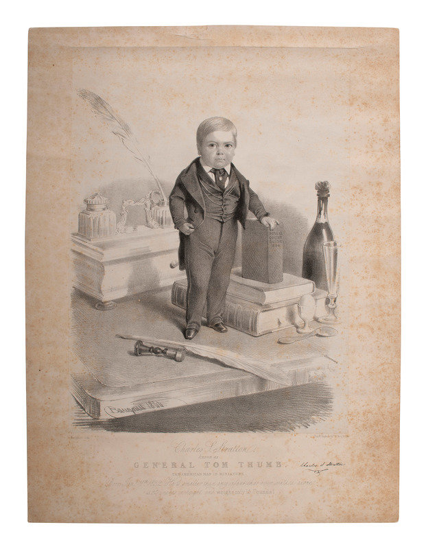 Lithograph of “Charles S. Stratton, Known as General Tom Thumb….Born Jan. 11th 1832. He is smaller than any infant that ever walked alone. Is 25 inches in height and weighs only 15 pounds!” 12-1/2 x 17” (moderate scattered browning) [London]: Day & Haghe, Publ. Baugniet (lith.), 1844(?)