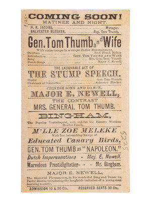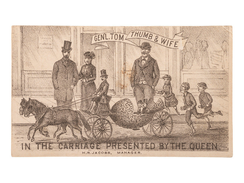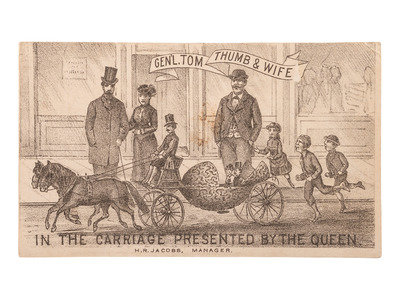 Postcard-sized lithograph, 3 x 5”, “Genl. Tom Thumb & Wife / In the Carriage Presented by the Queen. / H.R. Jacobs, Manager.” On verso is a list of appearances.