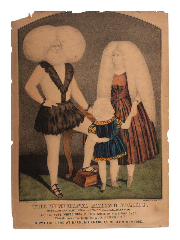 Hand-colored lithograph: "The Wonderful Albino Family. / Rudolph Lucasie, Wife and Child, from Madagascar. / They have pure white skin, silken white hair and pink eyes / though born of perfectly Black Parents!! / Now Exhibiting at Barnum’s American Museum New York.” New York: Currie & Ives, n.d. 10 x 14” (top edge damaged, including most of title gone, moderate browning)