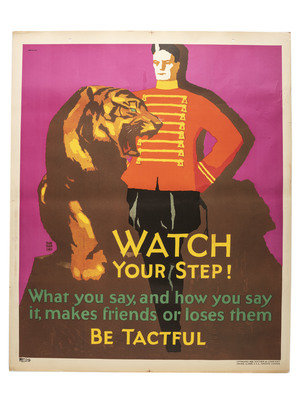 Watch Your Step! What you say, and how you say it, makes friends or loses them. Be Tactful. 36 x 44 in. (short tears and creases in margins, some light toning to margins, punch holes in top margin, as issued).