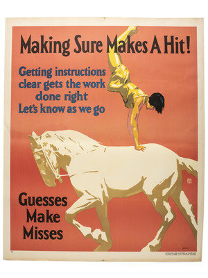 [With:] Making Sure Makes A Hit! Getting instructions clear gets the work done right. Let's know as we go. Guesses Make Misses. 36 x 44 in. (short tears and creases in margins, some light toning to margins, punch holes in top margin, as issued).