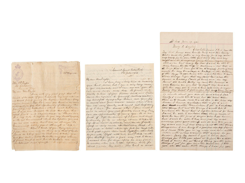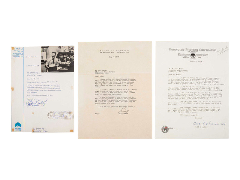 [With:] A group of 3 autographs of directors and newsmen. TLS by Cecil B. deMille (1881-1959), Hollywood, CA, 11 Feb. 1952. On Paramount Pictures letterhead with "Cecil B. deMille Productions" logo in lower left corner. To Ward Marsh, Cleveland Plain Dealer regarding a prospectus Marsh sent to deMille that seems to be in regard to filming a series of "pilot courses" at the Western Reserve University. In pencil upper right "copy for file." -- TLS, signed "King." King Vidor (1894-1982). Culver City, CA, 8 May 1945. On Selznick Studio letterhead. Also to Ward Marsh of the Cleveland Plain Dealer, thanking him for including one of Vidor's films in his "Ten Best" list of 1944. He explains to Marsh that he left MGM after they "butchered" one of his pictures and joined Selznick Studio to film the next one, "Duel in the Sun." He notes that he is currently not working because of "the strike." King Vidor directed over 60 films between 1913 and 1981, even trying his hand at acting in 1982 ("Love and Money"). He received 5 Academy nominations for best director. -- TLS, signed Chet Huntley (1911-1974). Big Sky, MT, 24 Jan. 1974. On Big Sky of Montana, Inc. letterhead. To Tex Jordan. Huntley writes that he has no first hand knowledge of Art Acord and only remembers him as a cowboy actor in a film when Huntley was young. With the front panel of the cover.