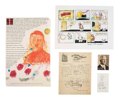 11.5 x 15.5 in. "Hagar the Horrible" color cartoon, signed "Very Best Wishes! Chris Browne" in lower margin. 1991 copyright. With TNS signed by Browne: "Thank you for your recent request of a Hagar item for your forthcoming auction. We have enclosed an autographed, hand-colored copy of a Hagar strip." Sarasota, FL, Jan. 6, 1993, on Hagar letterhead. Originally created by Dik Browne (1917-1989), Hagar was continued by Dik's son, Chris, after his death. Dik Browne was also a co-creator of Hi and Lois along with Mort Walker. Dik's son Chance and Walker's sons continued after the creators' deaths. --