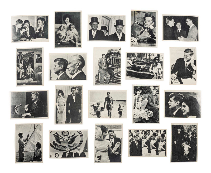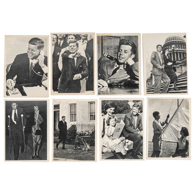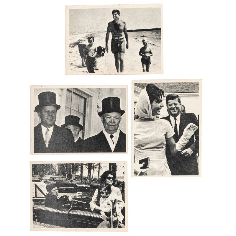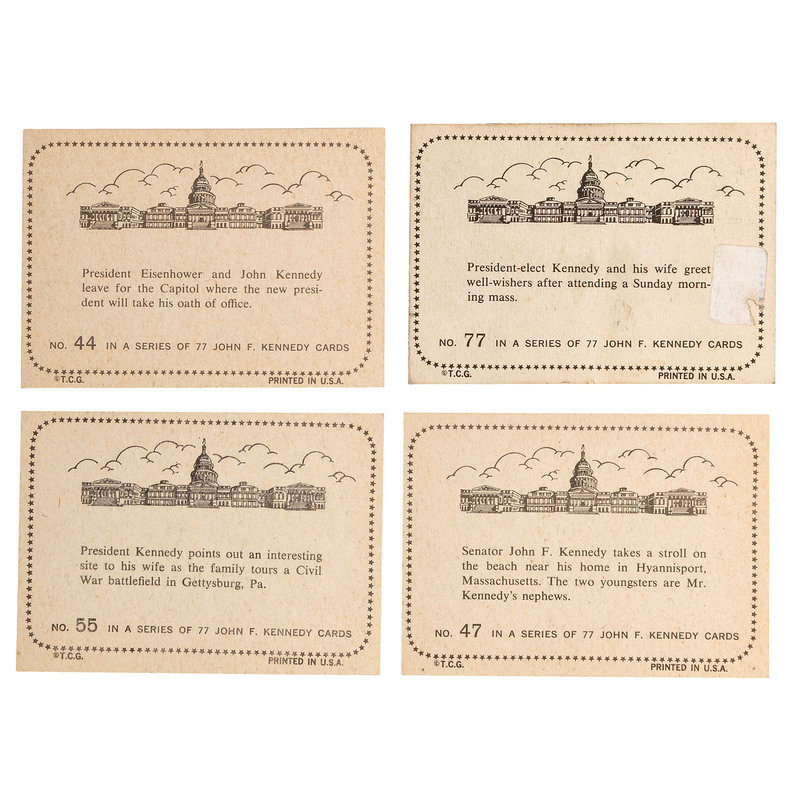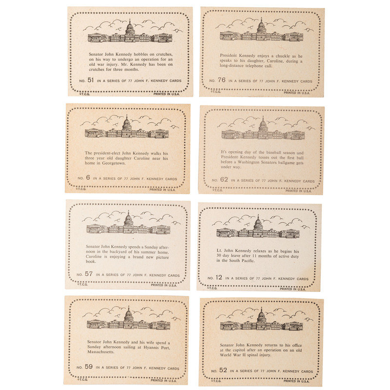 President John F. Kennedy collector cards, Topps, 1964, set of 71 out of 77. This set was issued shortly after JFK’s assassination in classic Topps style – black-and-white photo on the front, short caption on reverse. This set includes many of the important politicians of the day (Chancellor Adenauer #40, Marshall Tito #39, King Hassan II #18 and Eisenhower, Nixon and Johnson in the US) and shows Kennedy giving speeches in his animated style. However, it also includes the children and Jackie, leaving the impression of the importance of family. Even when the children are not pictured, they are in the “background.” Card #76, for example, is captioned: “President Kennedy enjoys a chuckle as he speaks to his daughter, Caroline, during a long-distance telephone call.” The set also includes pre-Presidential images, such as Jack and Jackie shortly after announcing their engagement, when Kennedy was still a Senator, as well as images from the wedding (#60, 73), a team photo of his varsity football team, and Kennedy relaxing on leave from service in the South Pacific during WWII. Missing cards 20-24, and 27.