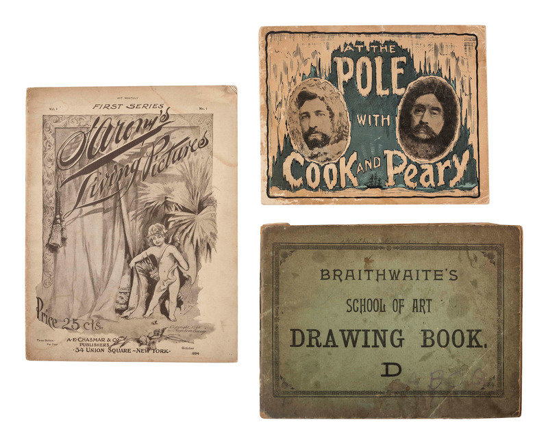 [Also with:] Segal, Lore (b. 1928). "Lucinella Apologizes to the World for Using It." 12 x 18 in. Selection from Lucinella, 1976, with color art. Published for Segal's residency in the Creative Writing Program at The Ohio State University, Winter 1991. Signed lower margin. Segal was a finalist for the Pulitzer Prize in 2008. Number 36 of 150 signed prints. -- Skvorecky, Josef. Selection from The Bass Saxophone, 1977. Published for Skvorecky's residency in the Creative Writing Program at The Ohio State University, Fall 1990. Signed near lower right corner. Number 43 of 150 signed prints. -- Klinker, Orpha (1891-1964). "Trees and Tide." Sepia print by Klinker. 6.5 x 8.5 in. on 8.75 x 11 in. sheet. Known for California landscapes and portraiture. -- Lindsay, Vachel (1879-1931). Poster, folded 17 x 28in. Print of pen and ink drawing on one side: "A Map of the Universe Issued in 1909. This map is one beginning of the Golden Book of Springfield." Surrounded by Egyptian hieroglyphs. The other side with "The Queen Bubbles." This begins: "All my true friends are petitioned to pin this poster on the parlor wall for fifty years, never to be ashamed of it, and to explain it in all its details to the world." Boldly signed at bottom with hieroglyphs below, butterfly in lower left corner. This copy 1921 of 2000 second edition posters. Some folds beginning to separate. Could be repaired. --