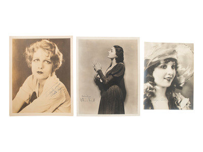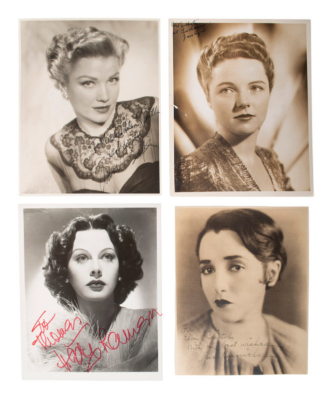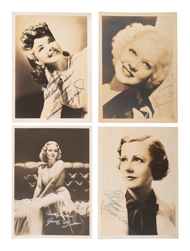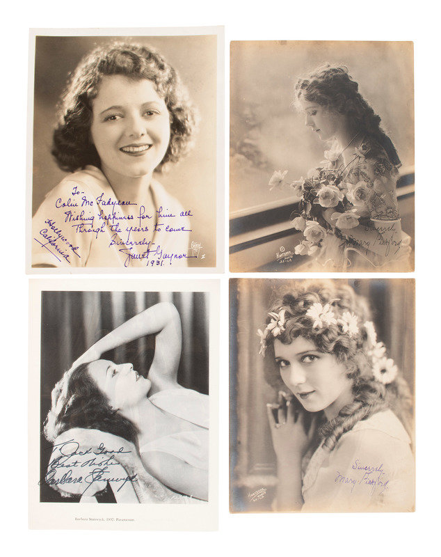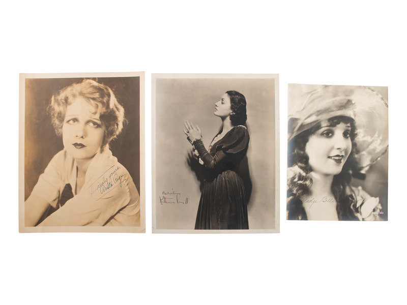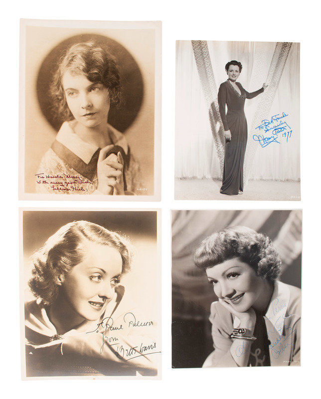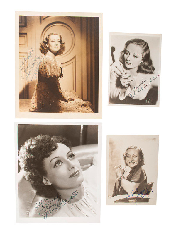 Joan Crawford, including 3 signed photographs and 5 TLsS, dated 31 January 1972, 19 December 1972, 24 April 1973, 16 January 1974, and 22 December 1976, each on "Joan Crawford" letterhead, 3 of which are accompanied by original envelopes with Joan Crawford's return address in Los Angeles, CA. -- Tallulah Bankhead. -- Mary Pickford (2). -- Lillian Gish. -- Claudette Colbert. -- Bette Davis. -- Barbara Stanwyck (signed page, presumably from book or magazine). -- Janet Gaynor. -- Mary Astor. -- Anita Page. -- Katharine Cornell, signed photograph with 5 x 8 3/4 in. handbill promoting Cornell's performance of the Antigone and the Tyrant at the Cox Theatre. -- Madge Bellamy. -- Jane Wyman. -- Frances Langford. -- Irene Dunne. -- Alice Faye. -- Jane Wyatt. -- Anne Baxter. -- Hedy Lamarr. -- Bebe Daniels. -- May Robson. -- Virginia Bruce. -- Alice Calhoun. -- Ruth Chatterton. -- Belle Bennett. -- Arline Judge (2). -- Phyllis Haver. -- Louise Fazenda. -- Sally Eilers. -- Claire Windsor. -- Evelyn Venable. -- Alice Terry (ink partially smeared). -- Estelle Taylor. -- Irene Rich (3). -- Betty Bronson. -- Mary Brian (possibly printed, but difficult to discern). -- Dolores Costello. -- Colleen Moore. -- Marjorie Rambeau. -- Dolores del Rio (signed page from magazine). -- Bessie Love. -- Marian Nixon (2). -- One actress whose name is difficult to discern.