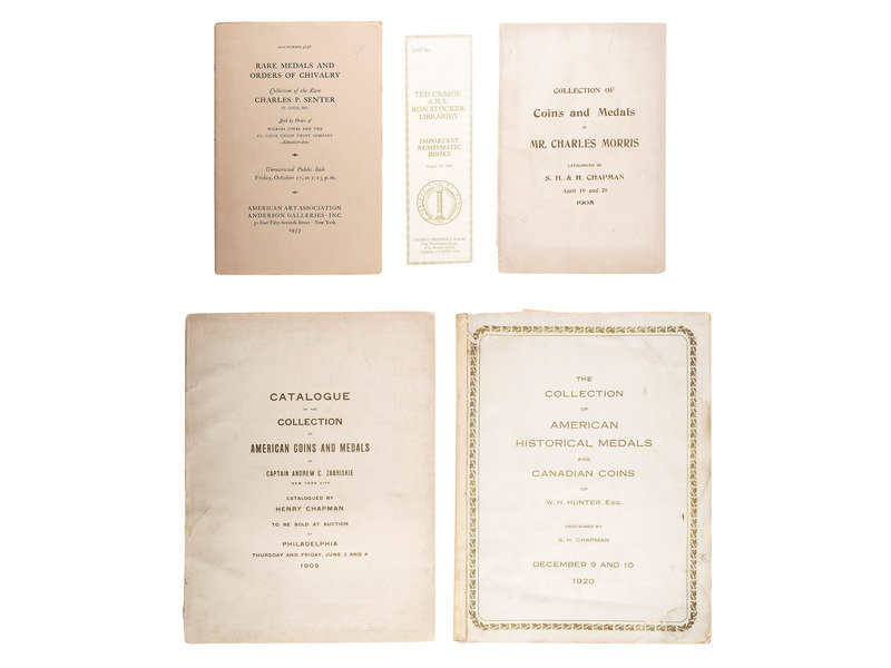 Part I. The Collection of Coins and Medals of the United States The Property of Mr. Charles Morris Chicago. Philadelphia: S.H. & H. Chapman, 1905. 8vo. Frontispiece. (Short tear to preliminary pages.) Original wrappers (light soil, some separation at spine, short tear at upper edge). -- CHAPMAN, Henry. Catalogue of the Collection of Colonial and State Coils...of Captain Andrew C. Zabriskie New York City. Philadelphia: Davis & Harvey, 1909. 4to. Frontispiece. Original wrappers. -- CHAPMAN, S.H. The Collection of Historical Coins and Medals Relating to American History, The Dominion of Canada, and Awards to Indian Chiefs and British Regal and War Medals Formed by W.H. Hunter, Esq. Toronto. Philadelphia: S.T. Freeman & Co., 1920. 4to. (Dampstain.) Original gilt wrappers (spine reinforced, dampstain). -- RAYMOND, Wayte. Early American Historical Medals. Medals Presented to Indian Chiefs. Orders of Chivalry. Art Medals and Plaques. Collection of the Late Charles P. Senter. New York: American Art Association, Anderson Galleries, Inc., 1933. 8vo. Frontispiece and 3 plates. Original wrappers. RARE: OCLC locates only 1 copy. -- Together, 4 numismatic auction catalogues.