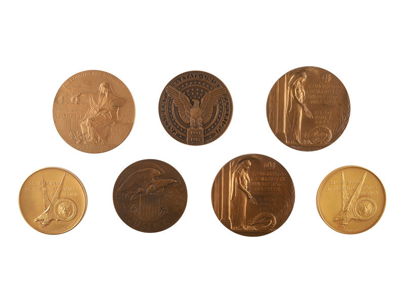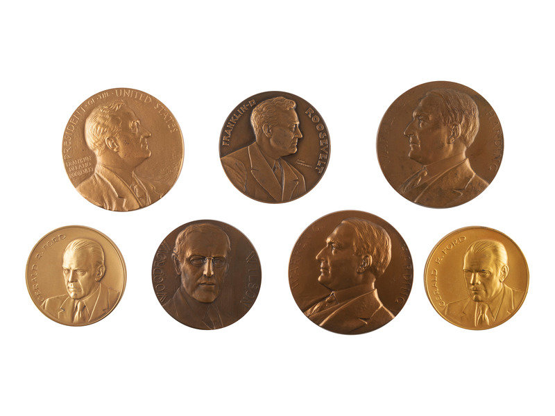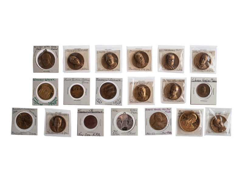 Political medals, approx. 3 in. diameter, honoring the inaugurations and presidencies of Franklin D. Roosevelt, Warren G. Harding, Woodrow Wilson, and Gerald R. Ford. -- Political medals, all approx. 1 1/4 in. diameter, featuring presidents Franklin Roosevelt, John F. Kennedy, Lyndon Johnson, Warren Harding, Woodrow Wilson, William Howard Taft, James Garfield, Dwight Eisenhower, and Herbert Hoover.