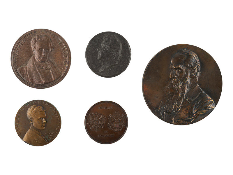 [With:] A wide variety of other ephemera including advertising tokens, campaign tokens, a Texas Centennial medal, Charles Lindbergh medal, "Lucky Penny," Pan-Am Exposition token, and more.