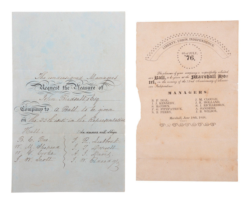 7 x 4 3/8 in. satiny coated paper invitation (creasing, with areas of light discoloration). Sheet vertically folded for delivery, with manuscript address "To The Attorney General" one one side and invitation text on the other. Partly printed invitation accomplished in manuscript requests the company of John Birdsall, Esq. at "a Ball, to be given on the 25th inst. in the Representative Hall." Ball managers listed below. Ca 1837. -- 4 x 6 1/4 in. printed invitation (light spots, creasing, one area of loss along left edge). Text banner reading "Liberty, Union, Independence" surmounts a circle of stars surrounding text, "4th of JULY, / '76." Text below invites the holder to a ball at Marshall Hotel, 18 June, 1848. Ball managers also listed. -- Together, 2 invitations to balls held in independent and early-statehood Texas.