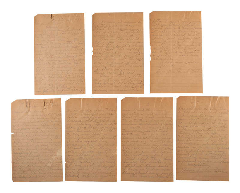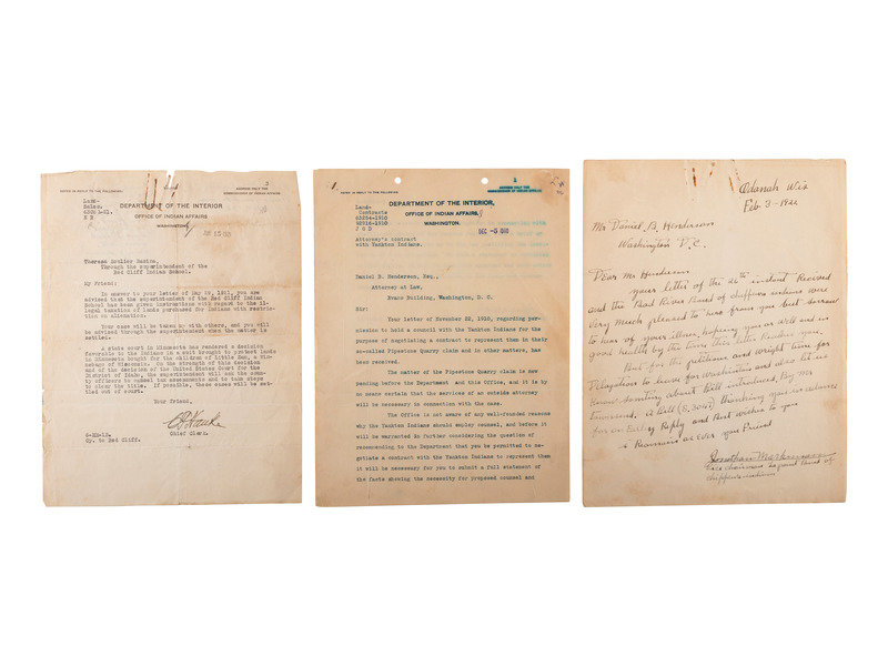 Letters related to ongoing Indian affairs, litigation, and delegations, highlighted by a powerful letter from Mrs. Theresa Basina, of the Red Cliff Band of Lake Superior Chippewa, stating that she is glad to have Mr. Henderson take up a case related to an allotment that was illegally taken from her: "The cold weather is here, and my children are in need of some thing warm [.] This farm was taken away from me because I did not keep up with my taxes, a white man paid them and he was the one that sold it to the man that is living on it at present, I never signed any papers for it ... The Indian Agent here will not do any thing to help me in this regard. Can you tell me in your next letter if you can help me, even my crops from a year ago and my furniture were taken, Now do you think that is fair? I am still living on the reservation, my husband makes a living by hard work, I shall be very thankful to at last locate a man that is a friend of the Indian." 11 September 1921. 4pp, 5 x 8 in. (heavily toned, imprint from rusted paperclip at top edge line).