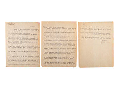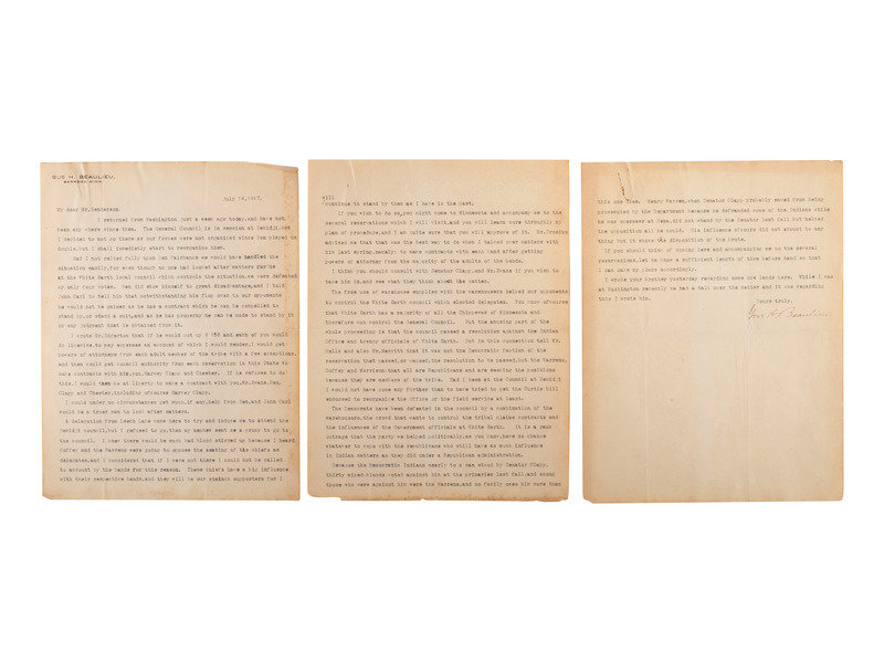 [With:] BEAULIEU, Gus (1852-1917). Typed letter signed ("Gus H. Beaulieu") to Mr. [Daniel] Henderson. Barrows, MN, 14 July 1917. 3pp, 8 1/2 x 11 in (spotting/discoloration and wear to edges, with discoloration/imprint from rusted paperclip to last page and approx. 1 in. tear extending inward from left edge of first page). Beaulieu discusses an upcoming General Council, efforts to control the White Earth council, and political affiliations amongst various tribal factions.