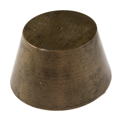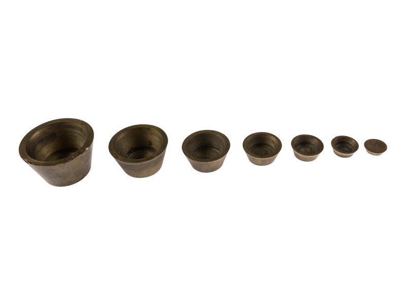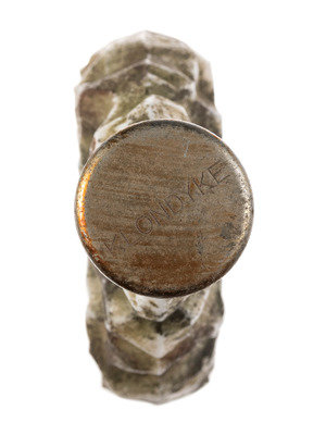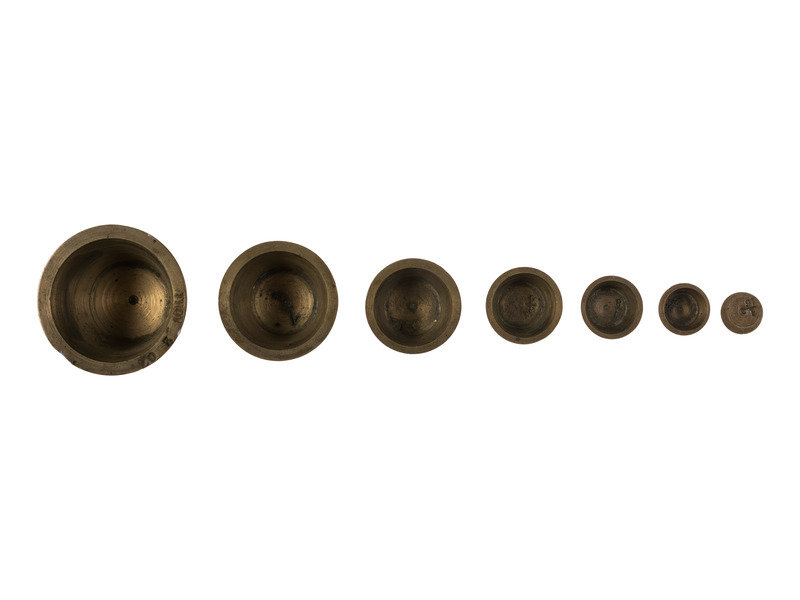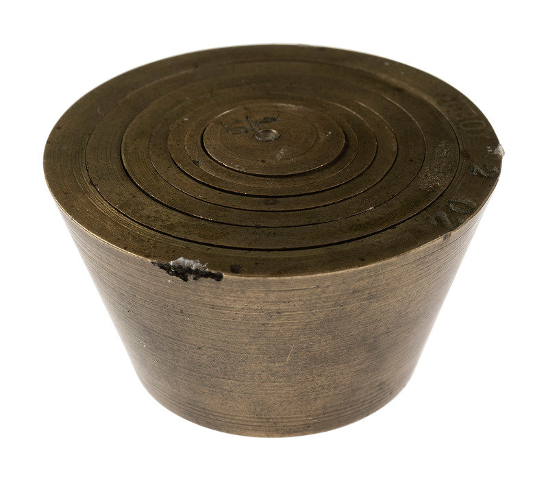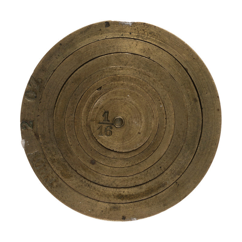 [With:] Replica 50-dollar gold slug. Diam. approx. 1 5/8 in. Obverse: "Facsimile of Famous Fifty Dollar Gold Slug used by the Pioneers / 1850.” Reverse: “Souvenir Pioneer Days of California/ The Days of '49 / Eureka." -- Set of 7 brass nesting gold or apothecary weights. Approx. 3/4 x 1 1/2 in. (outer cup without lid as issued). -- Folding knife with 2 knife blades and cork-screw, brass handle with blacksmith on one side and a miner on the other. Length 4 1/4 in. -- Milk glass Klondyke whiskey bottle flask. Height 6 in. (Losses to finish, lacking label.) -- Together, 4 souvenirs related to the Gold Rush.