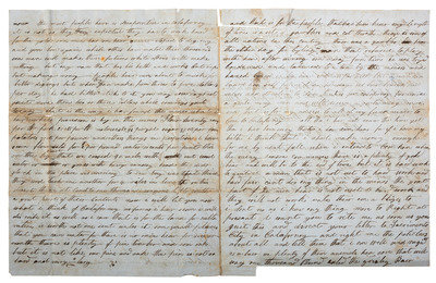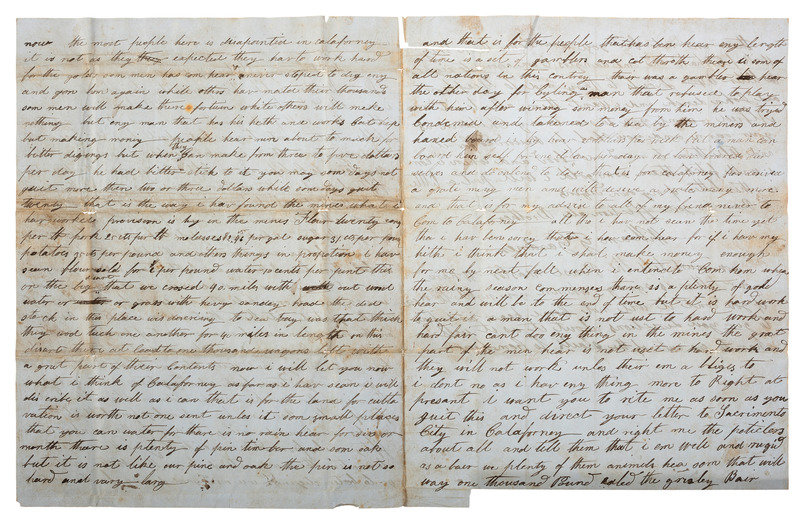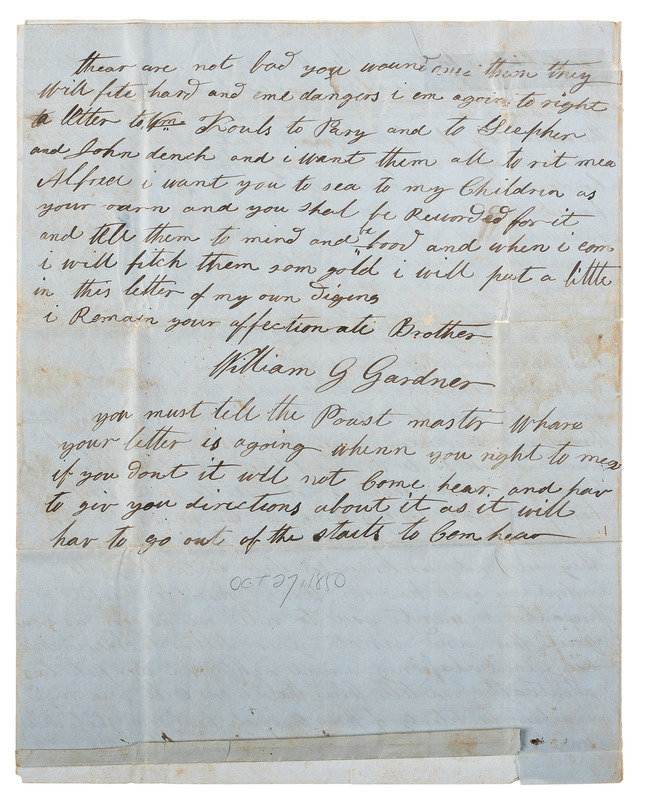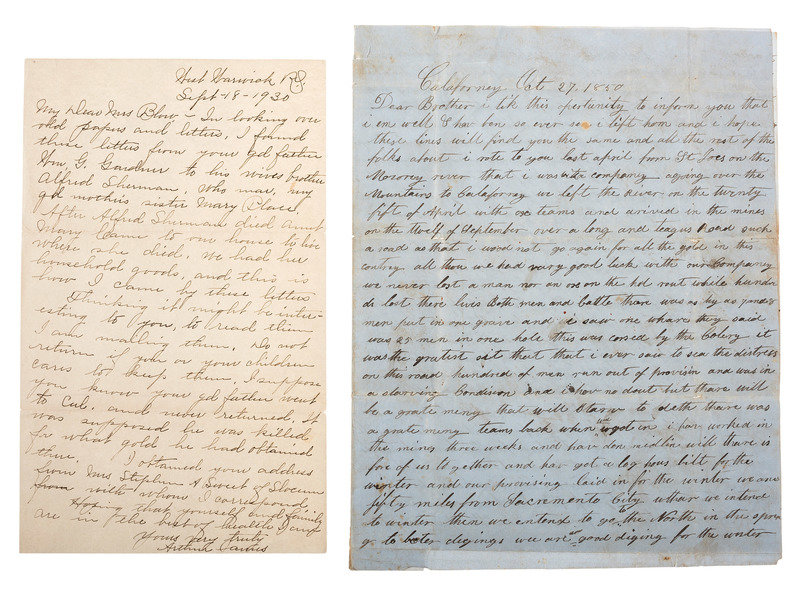 GARDNER, William ("William G. Gardner"), to his brother. California, 27 October 1850. 4 pages, 4to, old creases with some separations, brown spotting. The '49er writes home about his journey to "Calaforney." -- CANUS, Arthur ("Arthur Canus"). West Warwick, RI, 18 September 1930. 1 page, 8vo. The writer reports that he "found these letters from your gd father Wm. G. Gardner to his wives brother Alfred Sherman," and speculates that he "was killed for what gold he had obtained there." -- Together, 2 autograph letters signed.