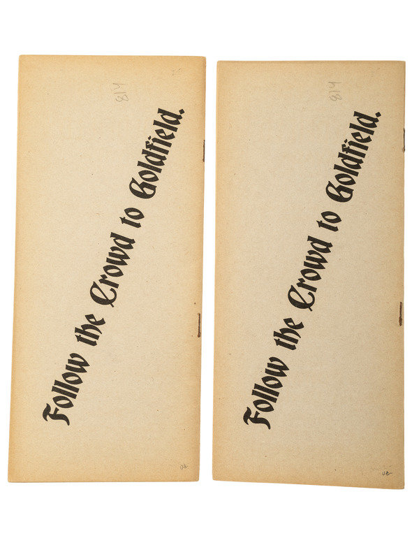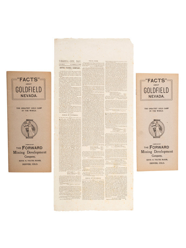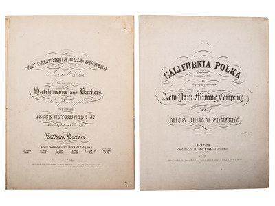 [Also with:] Sutro Tunnel Company. (Caption title). Virginia City, NV, 4 October 1869. 7 1/2 x 15 3/4 in. broadside. Three lengthy columns give information about the formation of the company and its authorization to dig a tunnel through the Comstock silver lode. RARE: OCLC locates only 4 copies. -- POMEROY, Julia W. California Polka. Composed for and Respectfully Dedicated to the New York Mining Company. New York: Wm. Hall & Son, 1849. 10 3/16 x 13 3/8 in. sheet music (minor soil). -- HUTCHINSON, Jesse Jr. and BARKER, Nathan. The California Gold Diggers. Boston: Oliver Ditson, 1849. 9 7/8 x 13 1/4 in. sheet music (toning, tape repair to hinge). -- NEEDHAM, D. and KELLOGGS & COMSTOCK, publishers. The Independent Gold Hunter on His way to California. I Neither Borrow Nor Lend. Hand-colored lithograph, ca 1850, sight 9 1/2 x 13 1/2 in., on wove paper, toned, framed. -- "Facts" About Goldfield Nevada. Denver, CO: The Forward Mining Development Company, 1904. 4 x 9 in. pamphlet (minor toning). Two copies. -- Together, 6 items of printed ephemera related to the Gold Rush.