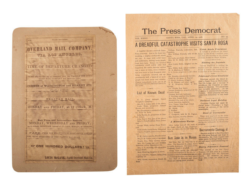 1906 San Francisco Earthquake Broadsheet. The Press Democrat, Santa Rosa, CA, April 19, 1906. Vol. 32, No. 93. “A frightful disaster overtook Santa Rosa yesterday. Just as the dawn was breaking, a mighty earthquake struck the city. It came with awful force and suddenness, hurling many people from their beds….” This was part of the earthquake that devastated San Francisco in 1906, and, although a larger city than Santa Rosa, the smaller town suffered relatively more destruction, with the downtown area being nearly totally flattened. Fortunately, Santa Rosa’s death toll was not as large as San Francisco’s. Although somewhat uncertain as to exact number, it seems as though “only” 70 or so people lost their lives in Santa Rosa. Of the over 3000 lives lost in the quake and/or subsequent fires, just under 200 were reported outside of San Francisco. About 70 of this number were Santa Rosa residents. The newspaper reported a “List of Known Dead” with 45 people known dead on the day after the quake, and a few more mentioned throughout the paper. Four of the known dead were Press Democrat employees, including Pressman Milo Fish.