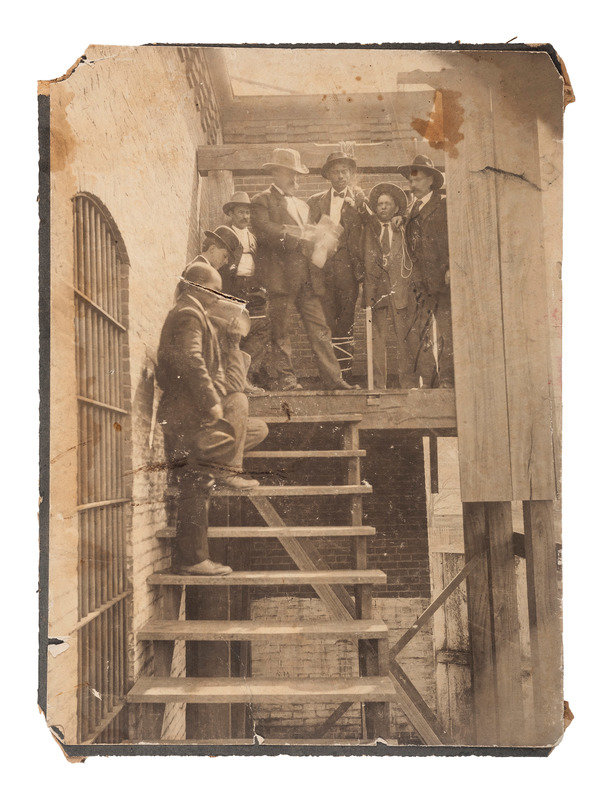 A Black man wearing a hat, bowtie, and boutonnière, stands at the center of the gallows, his feet bound with rope. He is surrounded by four white man on the platform, one shuffling papers as the photograph was captured. Three more men stand on the staircase leading up to the scaffold.