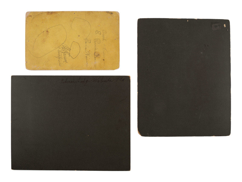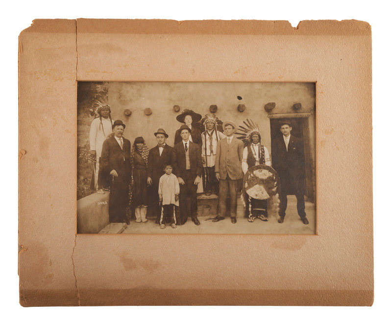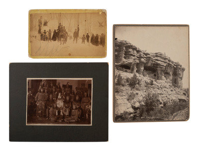 7 x 4 1/4 in. photograph (visible), under cardstock mat/mount, providing an outdoor portrait of group of Native Americans in traditional dress with white men and women, taken in the Southwest (as per modern tag) (toning to print; toning to mat, split along left edge of mat, chipping and some loss to mount). -- 7 5/8 x 4 3/8 in. boudoir photograph with faint "logging" notation on verso, which appears to show a mix of Native American and white subjects gathered together in a snowy setting (toning, fading to print, surface loss near top right corner, penciled scribbles and notations to print and mount verso; corner and edge wear, incl. areas of loss to mount). -- 6 1/2 x 4 1/2 in. photograph on cardstock mount showing a group portrait of members of the Redman Lodge, Wabasha, MN (verso inscription) (edge and corner wear to mount). -- 7 1/2 x 9 1/2 in. photograph of Mexican Cliff Dwellings, as titled in negative (light surface soiling; edge and corner wear to mount).