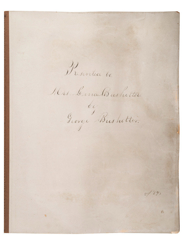 8vo, leather album (boards detached, significant wear and damage to extremities and album pages, with several images missing). Inside page inscription, "Presented to Mrs. Lina Bushotter by George Bushotter, 5/'89." With additional inscription on reverse side of page in colorful lettering, "Mrs. Lina Bushotter's Album For Friends." Album contains 24 photographs, incl. CDVs, cabinet cards, and tintype portraits of men, women, and children, credited to several different photographers, such as Tresslar Bros., Fort Scott, KS, P. Godfrey, Fulton, MO, Butts, Columbia, MO, Parsons, St. Louis, MO, Genellie, St. Louis, MO, C.J.J. Martyr, Norborne, MO, A.J. Bruce, Mexico, MO, W.M. Hollinger, Urbana, OH, P.C. Hunter, Martinsburg, WV, and Merritt Wood, Washington, DC. Highlights include: