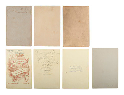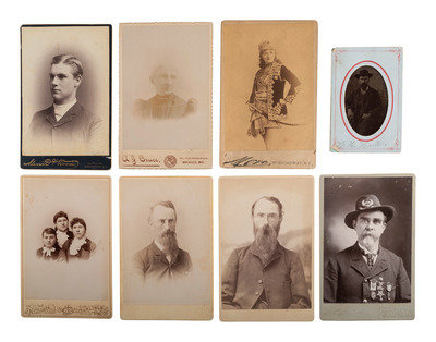 [With:] Cabinet card of a Union veteran wearing a wide-brimmed hat with GAR insignia and numerous medals on his chest. Beaver Falls, PA: Leigh (light nicks to print surface). -- Cabinet card of a female actress. New York: Mora (toning and soiling to print and mount). -- 2 1/2 x 3 3/4 in. tintype in paper mount/sleeve of a serious-looking fellow (creasing to plate, some surface wear). S.L. Sears, "Traveling Photographer" (imprint to sleeve verso). Subject identified as "W.H. Hull" on paper sleeve.