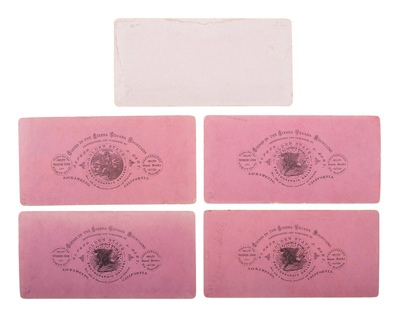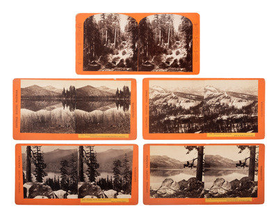 [Also with:] Am. River and Canyon from Cape Horn. River below R.R. 1,400 feet. 57 miles from Sacramento. On yellow cardstock mount. -- Donner Lake, with Crested Peak and mt. Lincoln in distance. -- Summits of Sierras. 8,000 to 10,000 feet altitude. -- Castle Peak, from Railroad, above Donner Lake. -- Railroad around Crested Peak. View from foot of Lake Donner. -- Together, 5 stereoviews by Alfred A. Hart, Sacramento, CA, each approx. 6 1/8 x 3 in. on orange cardstock mounts, except where noted, each with series title "Central Pacific Railroad, California," printed to mount rectos, paper title labels affixed to rectos, photographer's imprint to mount versos, minor toning.