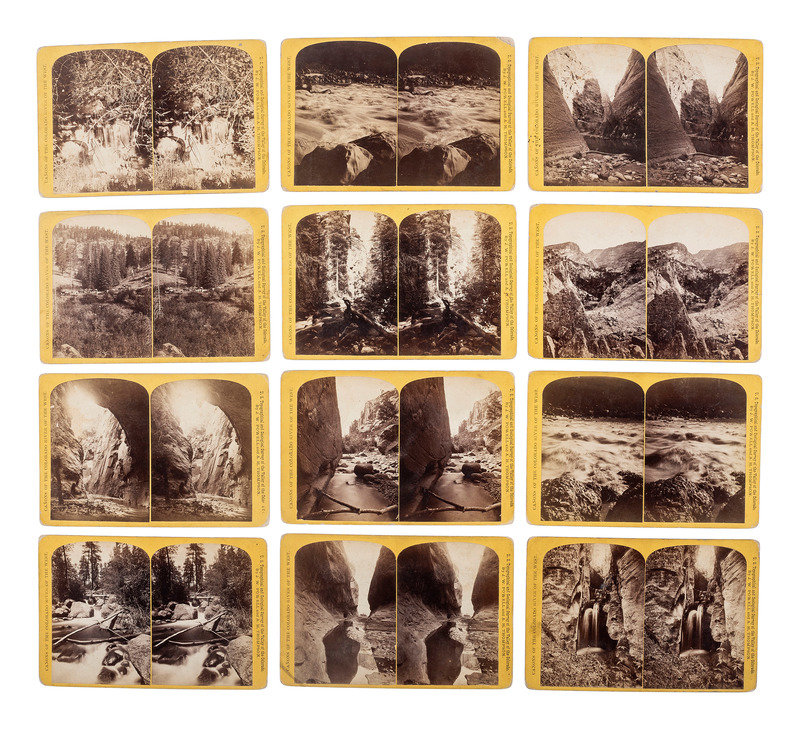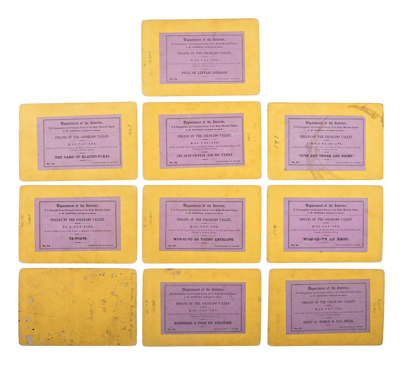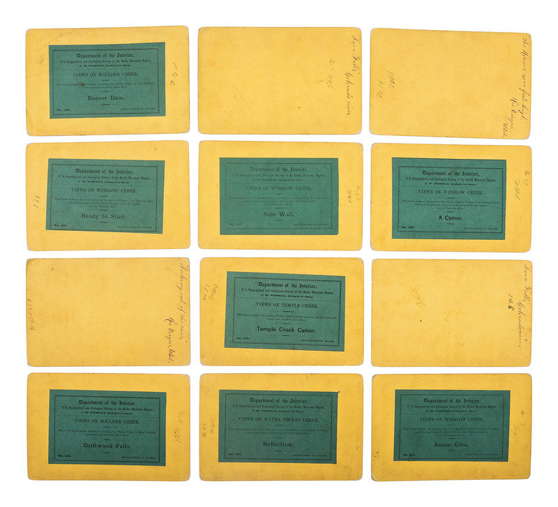 6 1/8 x 4 3/8 in. stereoviews on cardstock mounts (overall very good condition, strong tonality, some with light soiling; corner and edge wear to mounts, incl. some with surface abrasions). Rectos feature series titles "Canons of the Colorado River of the West" and "US Topographical and Geological Survey of the Valley of the Colorado, By J.W. Powell and A.H. Thompson" imprint. Most versos with applied paper labels including "Department of the Interior, US Geographical and Geological Survey of the Rocky Mountain Region" imprint, credit to Hillers, image number and title.