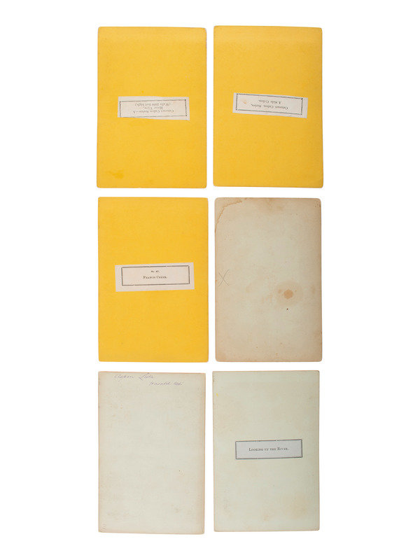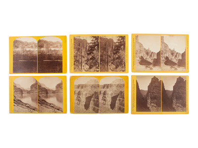 6 x 4 1/2 in. stereoviews on cardstock mounts (very good condition overall, some with toning, light spotting; corner and edge wear to mounts, including some creased corners and edges, staining to margins). Most rectos feature series titles and "US Topographical and Geological Survey of the Valley of the Colorado, By J.W. Powell and A.H. Thompson" imprint. Some versos with applied paper labels including just image title or series title, image number and title, and credit to Hillers. Some with manuscript title.