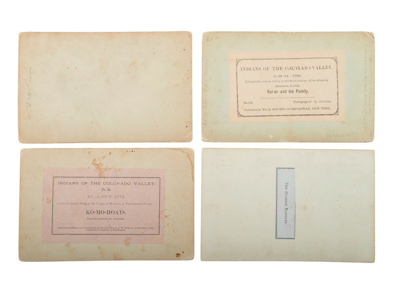 Titles include: 15. Pai Ute Indians (manuscript to verso). -- 47. Francis Creek. -- 66. Nu-A-Gun-Tits. A tribe of Indians living at the Ve-gas, or Meadows, in Southwestern Nevada. Ko-Mo-Hoats (top left edge of print and mount partially separated from bottom of mount, creasing and some loss to corners). -- 103. U-in-ta Utes. Living in the U-in-ta Valley, on the Western Slope of the Wasatch Mountains, in Utah. Sai-ar and his Family. -- Looking up the River. -- Cataract Canon Series, A Side Canon. -- Cataract Canon Series, A River View (Walls 2600 feet high). -- The Spanish Bayonet. -- Untitled canyon view. -- Aspen Lake, Wasatch Mts. (manuscript to verso).