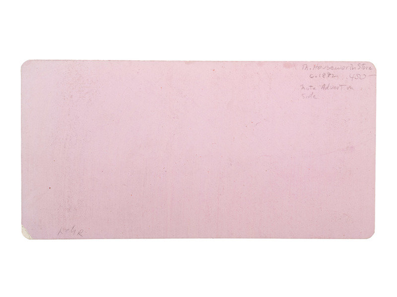 An exterior view of Thomas Houseworth's storefront, with promotional signs hanging along the front and side of the building and work displayed in the windows.