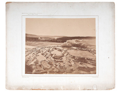 10 x 12 3/4 in. albumen photograph on 16 x 20 in. mount (light, even toning to print; mount lightly soiled with heavier soiling along the bottom edge, plus worn corners, all missing the extreme edge). Titled in the negative. Mount with Hayden Expedition imprint at upper left and credit to Jackson at lower left.