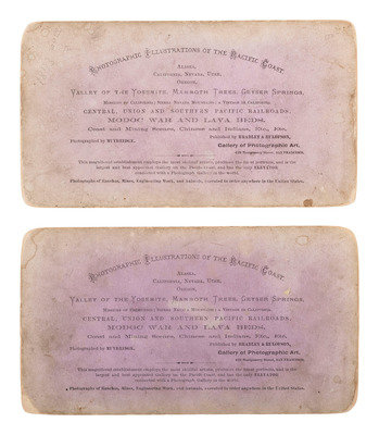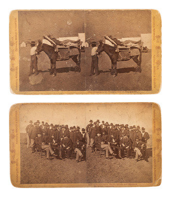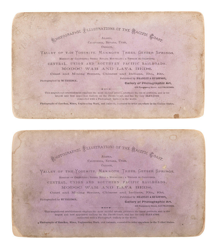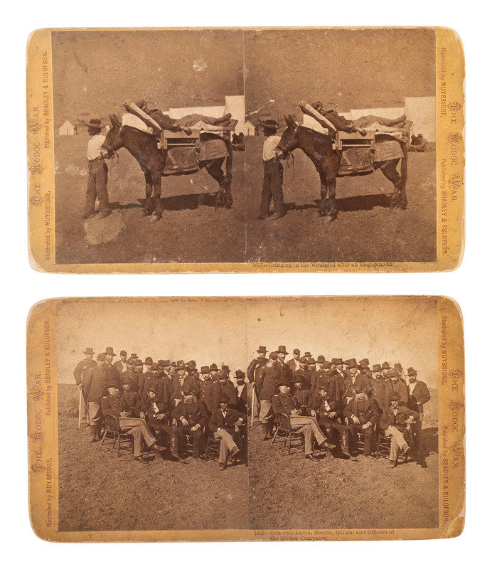6 x 3 5/8 in. stereoviews on cardstock mounts (toning, soiling to each print; corner and edge wear to mounts incl. some surface loss to verso, staining to margins). Rectos with imprint of Muybridge and Bradley & Rulofson, "The Modoc War" series title, and image title in lower margin. Versos with credits to both Muybridge and publishers Bradley & Rulofson.