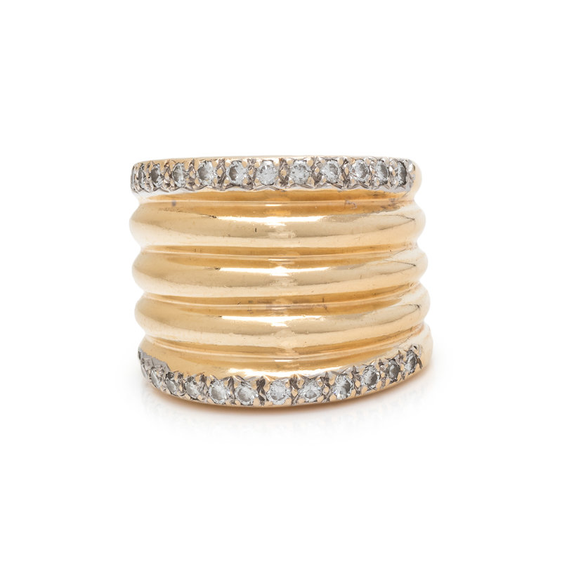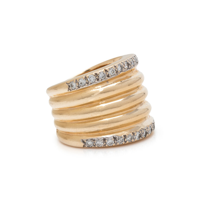 Containing 26 round brilliant cut diamonds weighing approximately 0.65 carat total. Ring size 4 1/2.