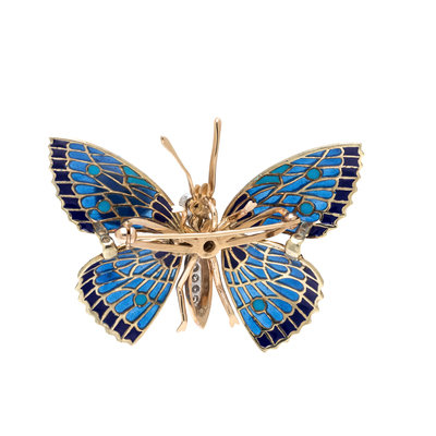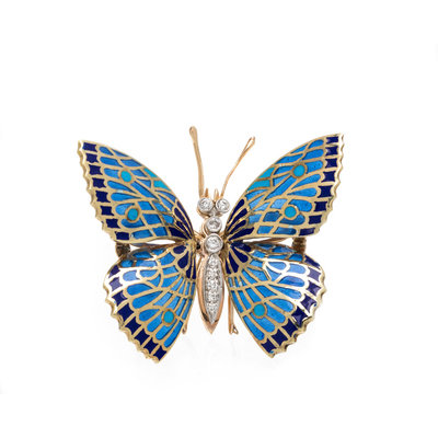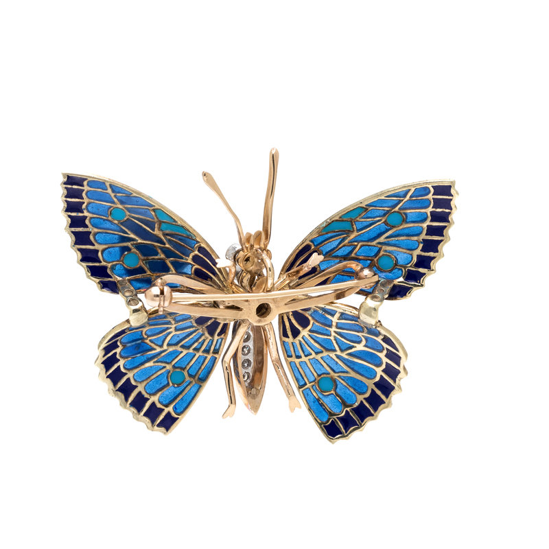 Consisting of articulated polychrome plique-à-jour enamel wings and the body containing nine round brilliant cut diamonds. Mounted in yellow gold. 1 7/8 x 1 3/4 inches.