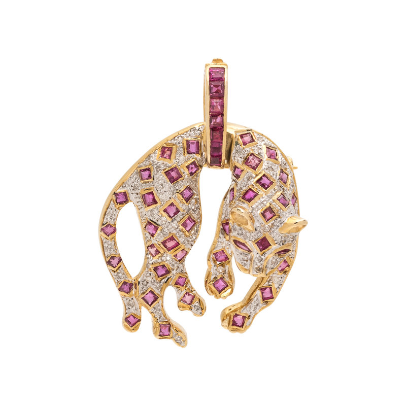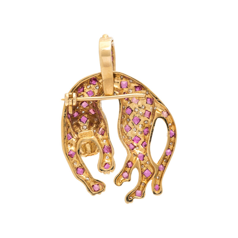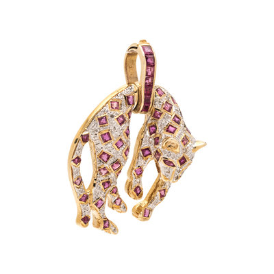 SYNTHETIC RUBY AND DIAMOND LEOPARD PENDANT/BROOCH