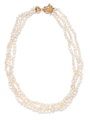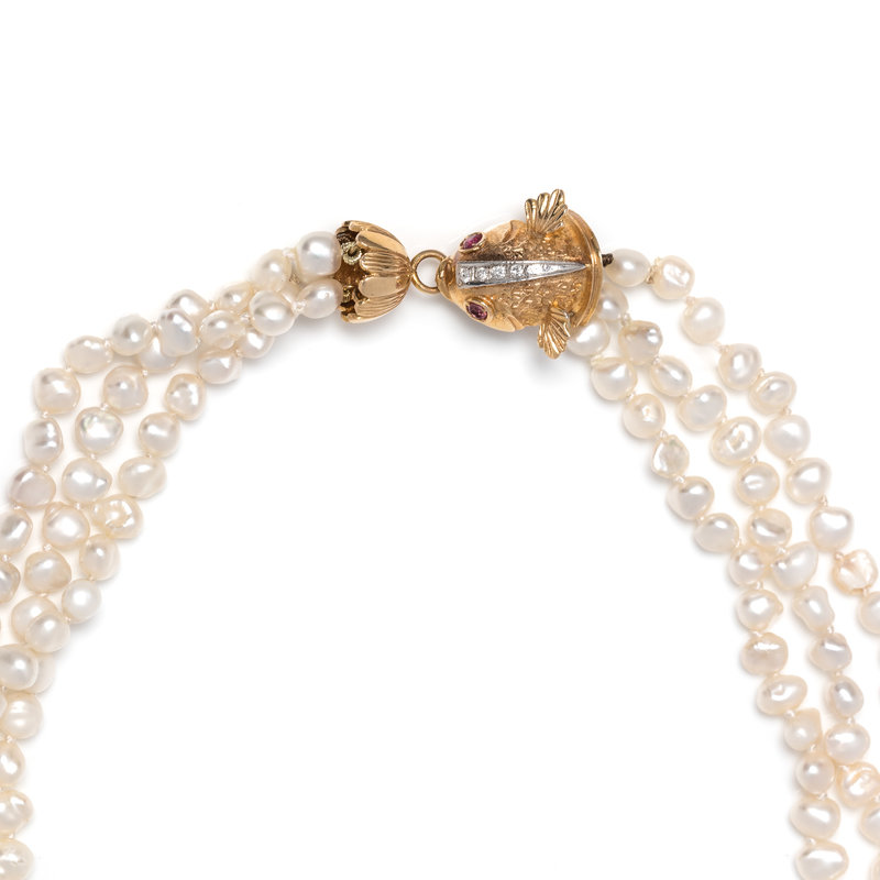 Consisting of three strands of freshwater pearls, strung knotted with a yellow gold fish clasp containing two ruby eyes and four round brilliant cut diamonds. 17 inches long.