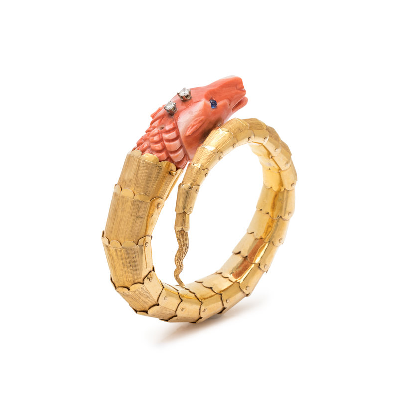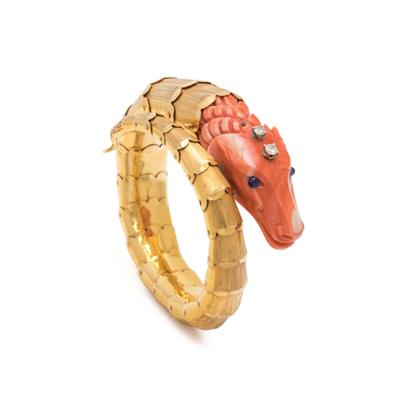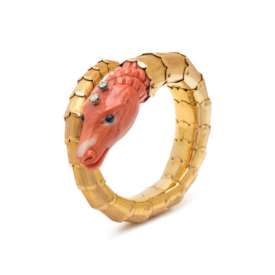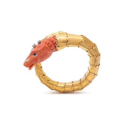 In a dragon motif design, with flexible link bracelet, containing a carved coral head, sapphire eyes and two round brilliant cut diamonds. 6 1/4 inches inner circumference.