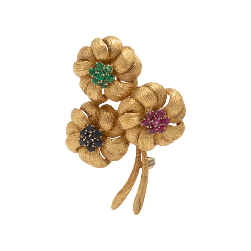 Consisting of a textured flower design containing seven round emeralds, rubies and sapphires. 1 1/2 x 1 3/4 inches.