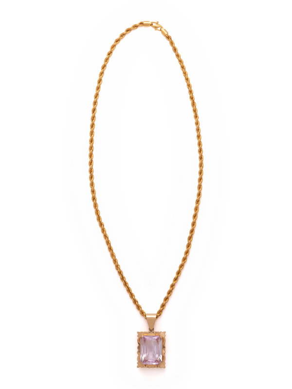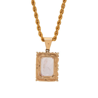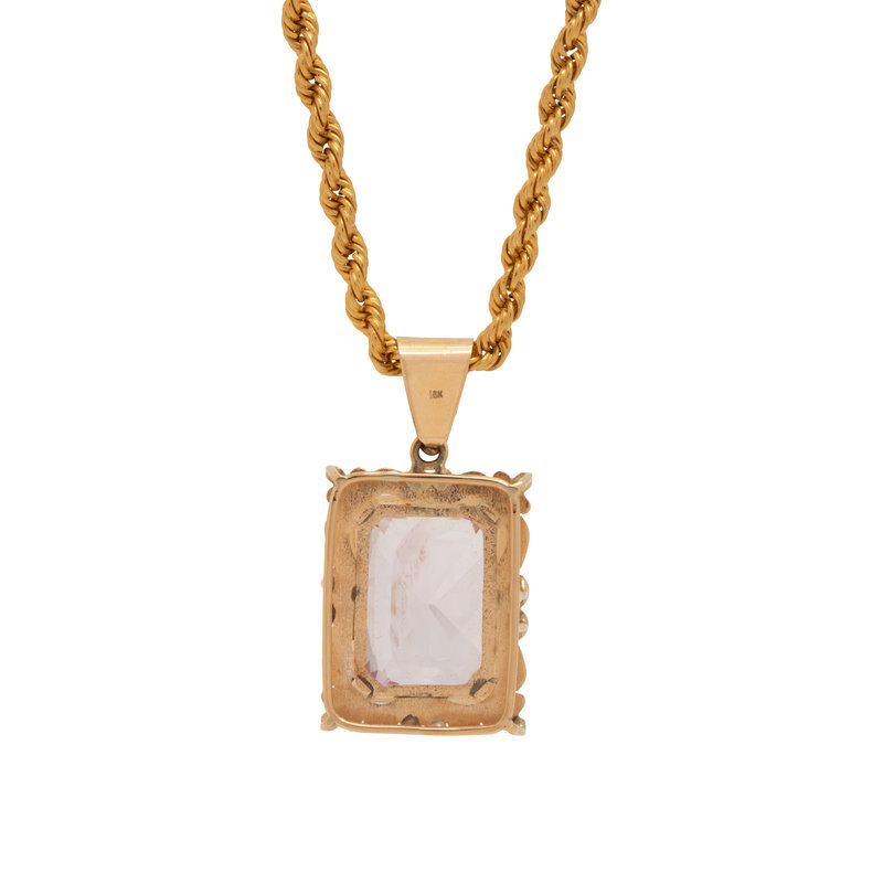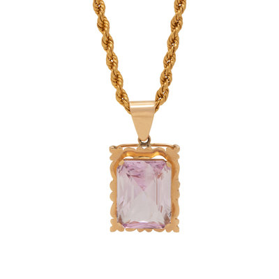 Consisting of a pendant containing one rectangular mixed cut kunzite measuring approximately 25.00 x 20.00 mm, suspended from a rope chain. 23 3/4 inches long.