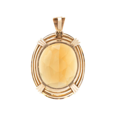Containing one oval mixed cut citrine measuring approximately 33.00 x 27.00 x 19.00 mm. Mounted in rose gold. 1 1/2 inches long.