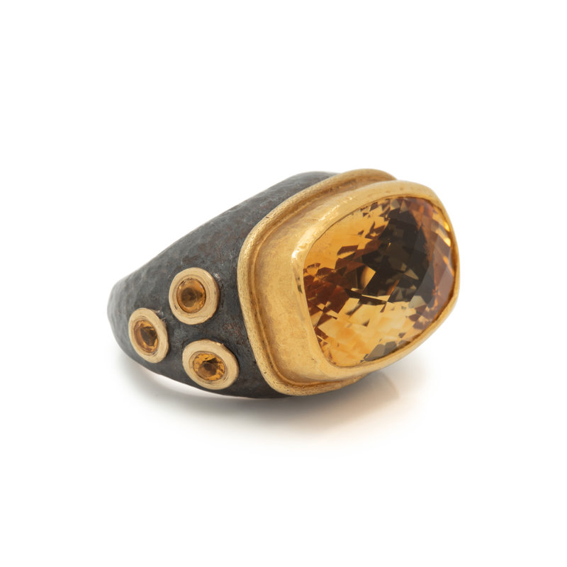 Containing one cushion checkerboard cut citrine measuring approximately 13.20 x 21.45 mm and six round mixed cut citrines. Mounted in blackened silver and high karat gold. Ring size 7.