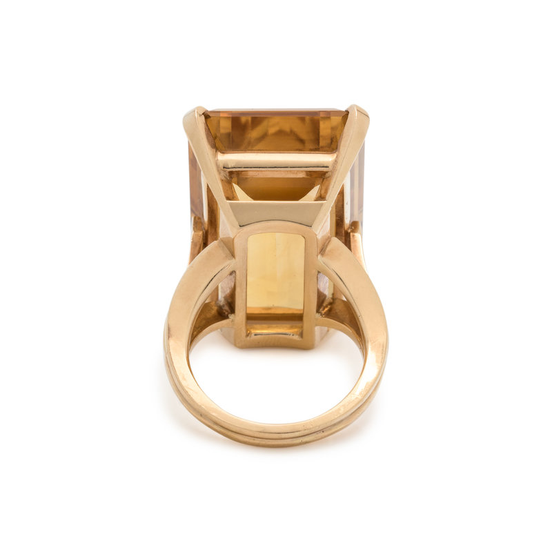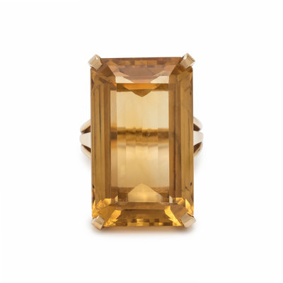 Containing one emerald cut citrine measuring approximately 31.00 x 18.50 x 11.60 mm. Mounted in rose gold. Ring size 7 1/2.