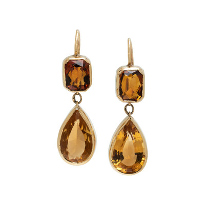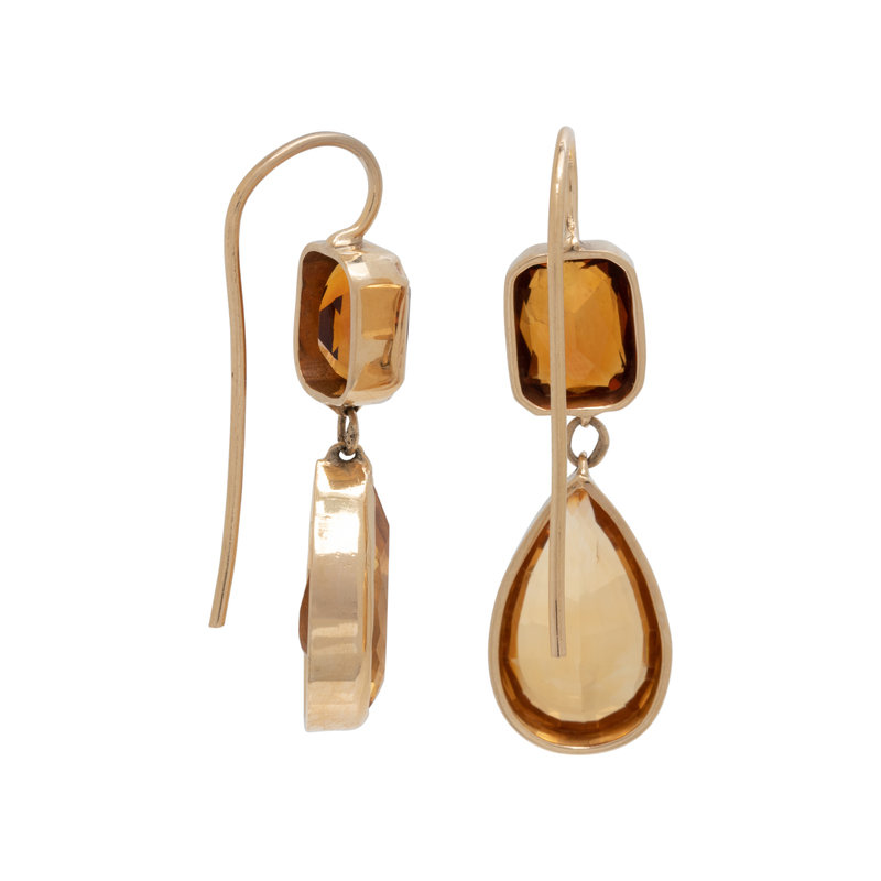 Containing two rectangular mixed cut citrines and two pear shaped citrines. Mounted in yellow gold. 1 1/4 inches long.