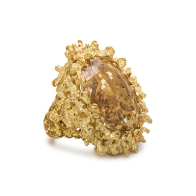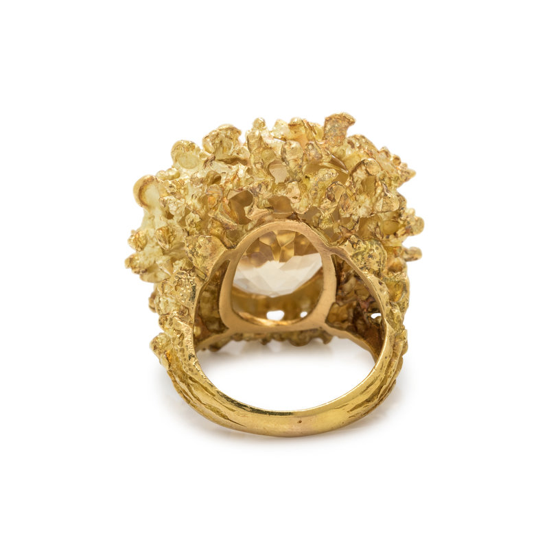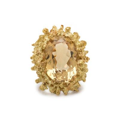 Containing one oval mixed cut citrine measuring approximately 21.35 x 16.00 x 10.00 mm. Ring size 4.