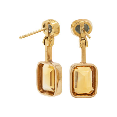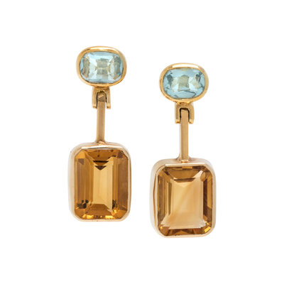 Containing two emerald cut citrines measuring approximately 10.00 x 8.00 mm and two oval mixed cut aquamarines. Mounted in yellow gold. 1 inch long.