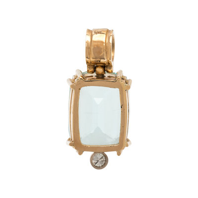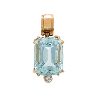 Containing one cushion mixed cut aquamarine measuring approximately 20.40 x 15.50 x 12.15 mm and one round brilliant cut diamond weighing approximately 0.18 carat. Mounted in yellow gold. 1 3/8 inches long.