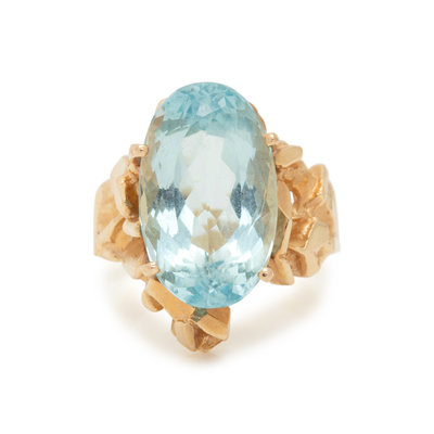 Containing one oval mixed cut aquamarine measuring approximately 17.25 x 10.60 mm. Mounted in yellow gold. Ring size 6 1/4.