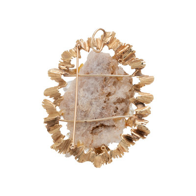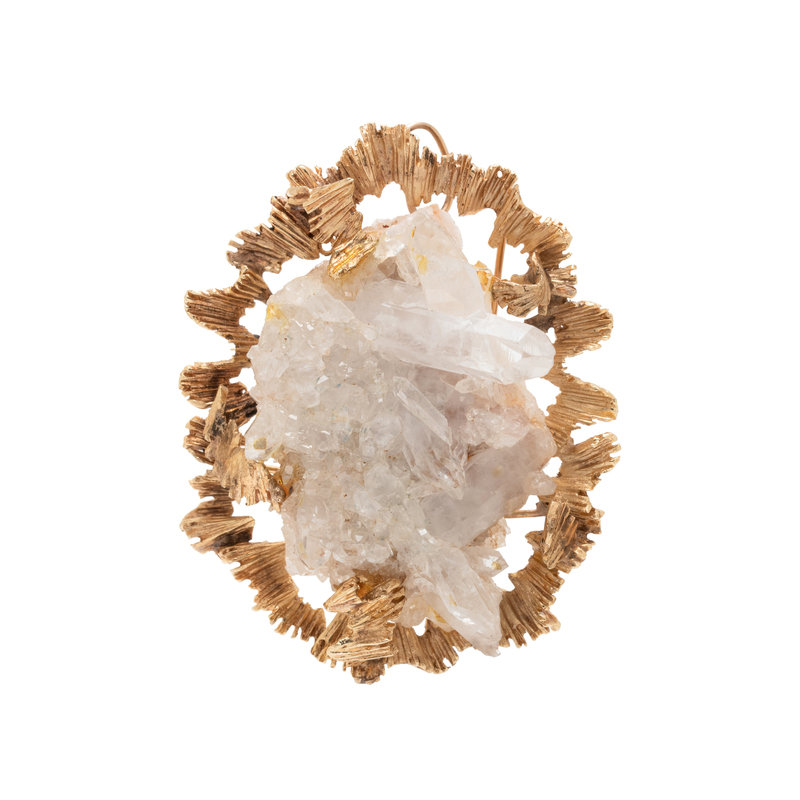 Consisting of a textured gold surround containing a rough quartz crystal formation. 2 3/4 x 2 1/8 inches.