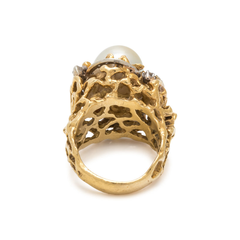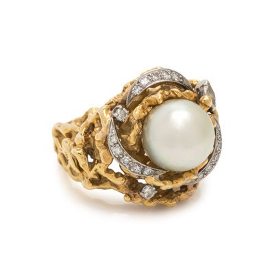 YELLOW GOLD, CULTURED PEARL AND DIAMOND RING